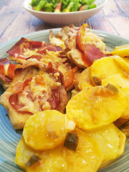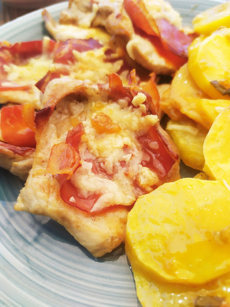 En una sartén de horno ponemos las rodajas de patata, luego los filetes de lomo, echamos una cucharadita de tomate frito encima, ponemos los filetes de jamón cortados por la mitad, echamos queso rallado al gusto y metemos en el horno precalentado a 180º hasta que veamos que el queso está derretido y dorado.