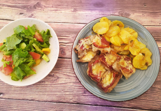 Yo he elegido para mi primera receta robada (y voy muuuuy tarde), estos FILETES DE LOMO CON JAMÓN, y además, gratinados ummmm, que rico. Lo único que he cambiado de la receta, es que no he enharinado los filetes, y que en vez de arroz, lo he acompañado de una rica ensalada y patatas al horno. Si queréis ver su receta, pinchad Aquí.