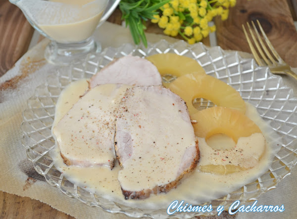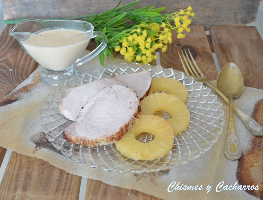 Sacar y reservar la piña y el lomo, el jugo ponerlo en una sartén junto con la nata (crema de leche) y dejar cocer un par de minutos, probar y rectificar de sal si fuese necesario.