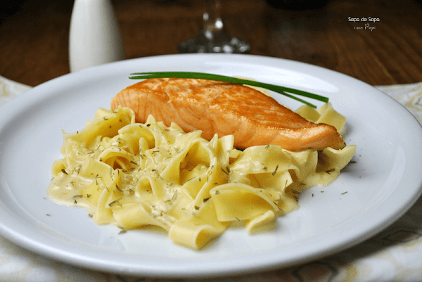 Cinta de pasta en salsa de estragón y lomo de salmón