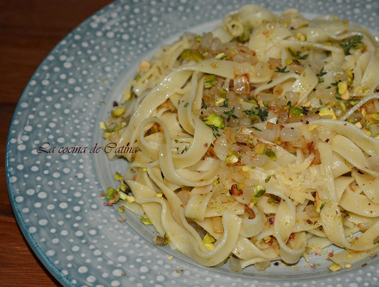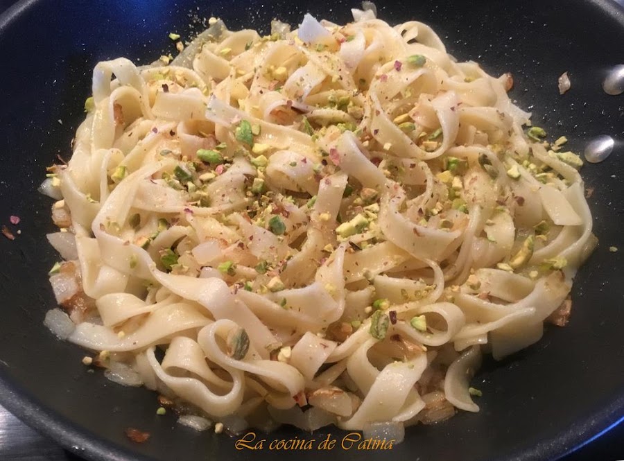 Distribuimos las cintas en los platos de servir, repartimos por encima los pistachos y espolvoreamos con el queso rallado.
