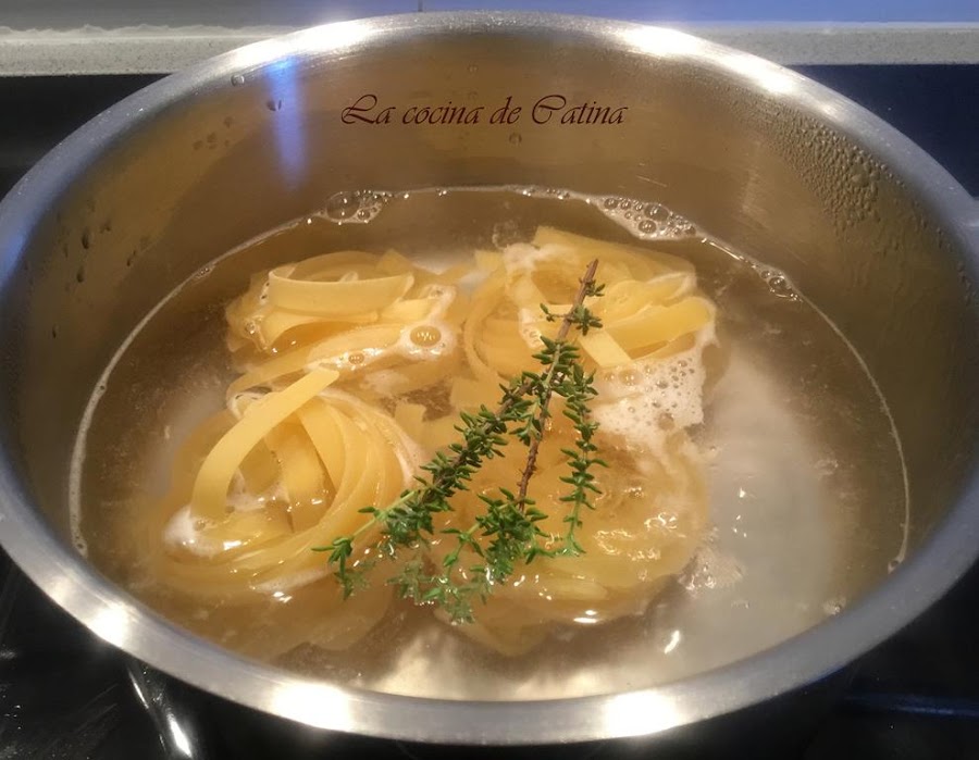 Llenamos una olla con bastante agua, le añadimos una pizca de sal y le ponemos una ramita de tomillo. La colocamos al fuego y llevamos a ebullición, cuando empiece a hervir agregamos las cintas y las hervimos hasta que estén al dente. Las escurrimos y reservamos una taza de agua de la cocción.Rallamos finamente la piel del limón, evitando la parte blanca y exprimimos medio para conseguir una cucharadita de zumo de limón.
