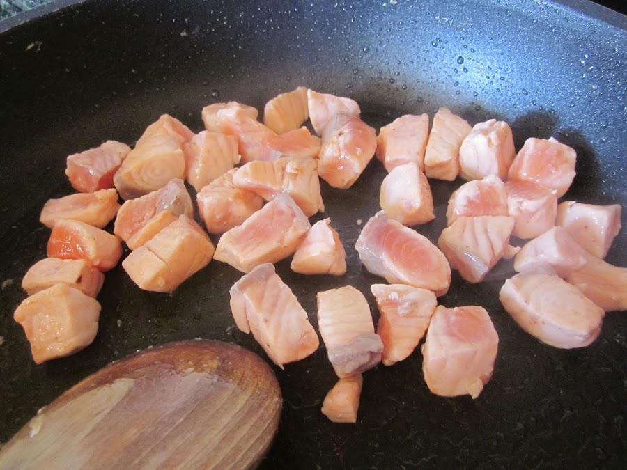 Cortamos el salmón en dados, salpimentamos y reservamos.