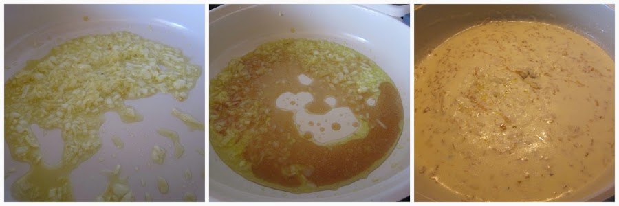 Hacemos un sofrito con la cebolla muy finita cortada y a fuego lento, cuando empiece a tomar color, añadimos el vino y evaporamos, añadimos la nata (crema de leche), el tomillo y salpimentamos, cociendo a fuego muy suave.