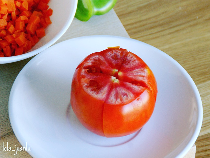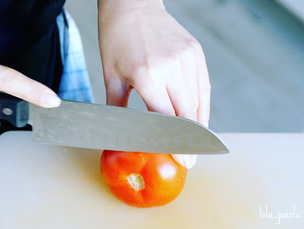Cortamos la parte superior del tomate y hacemos unos cortes en cruz. Reservamos.
