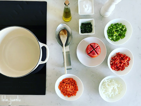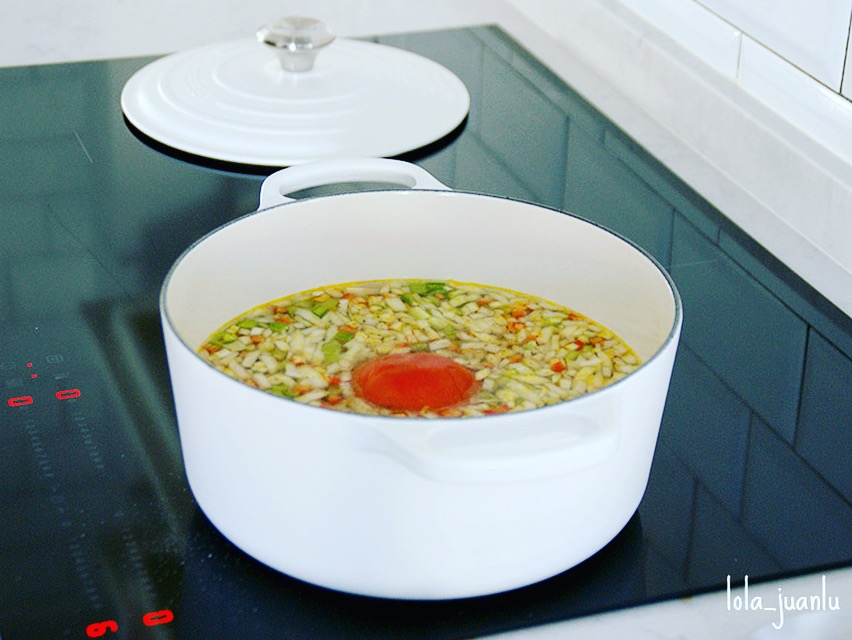 Cuando tengamos las verduras un poco sofritas, le añadimos el agua y salpimentemos. Llevamos a ebullición.