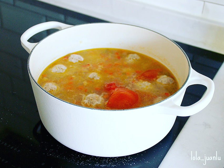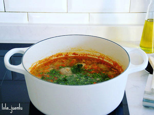 Cuando las verduras estén al dente, le añadimos las albóndigas y dejamos cocer 10 minutos.