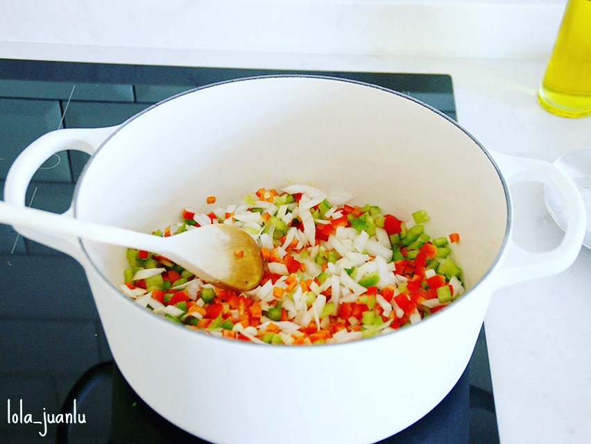 Una vez tenemos todas las verduras preparadas las echamos en una olla con un poco de aceite y las sofreímos. Es mejor que no las cocinemos mucho.