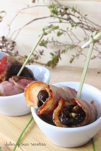 Las rellenamos con media nuez y las envolvemos con media loncha de bacon. Las pinchamos con un palillo y las ponemos en un recipiente para horno.