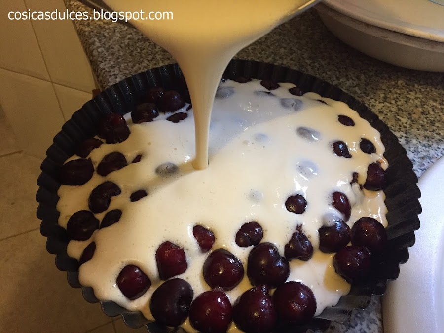 Aunque había oído hablar en muchas ocasiones de esta receta de origen francés no fue hasta que me la recomendó mi buen amigo Cristóbal, un cocinero de diez, cuando me decidí a prepararla. Si Cristóbal me la recomendaba era porque realmente merecía la pena prepararla. Me aseguró que pese a su sencillez el resultado final realmente era sorprendente así que aprovechando que tenía cerezas en casa me puse manos a la obra. Aunque la receta original insiste en la necesidad de hacerla sin deshuesar las cerezas yo soy de las comodonas a la hora de disfrutar de un postre así que opte por darle uso a maquinita deshuesadora y un periquete tenía lista mi tarta. Espero que os guste.