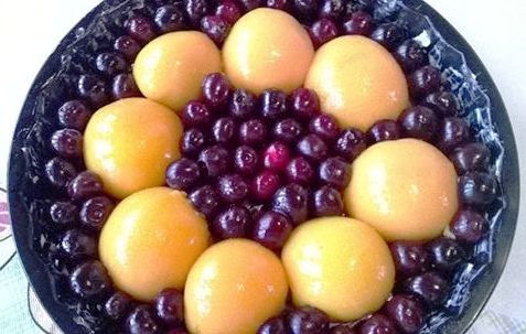 Fruta suficiente para cubrir la base de un molde que vaya al horno. Yo utilicé cerezas y melocotones en almíbar.