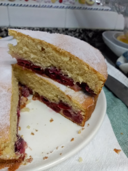 Yo la he hecho igual pero he deshuesado las cerezas con una facil tecnica que os explico mas adelante. La receta original dice que van con hueso para que los líquidos que desprende la cereza al deshuesarla no manchen la tarta. Con mi técnica de deshuesado no os ocurrira esto y nos podremos tomar una tarta muy rica sin necesidad de ir retirando huesos de la boca.