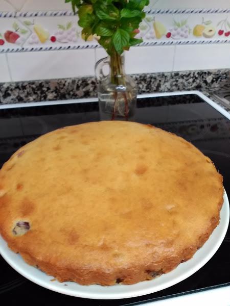 7.- Coloca las cerezas en el molde y añade la mezcla preparada. Hornea a 180º durante 40 min. Deja entibiar un poco y desmolda. Cuando este casi frio espolvorea de azucar glass.