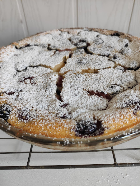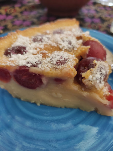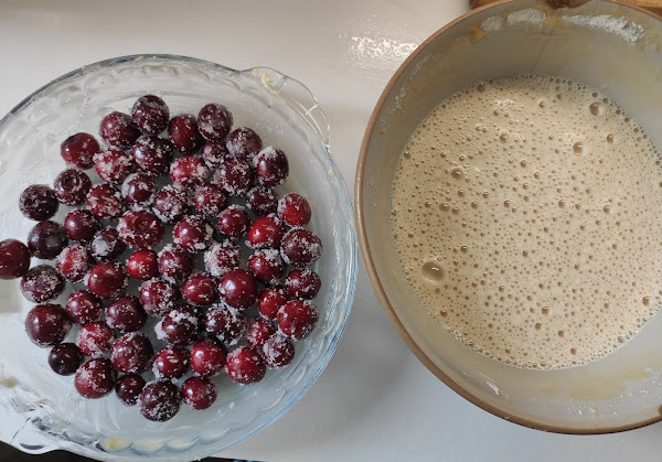 Añadimos la almendra molida y la harina tamizada. Mezclamos todo bien y añadimos la leche poco a poco hasta que esté toda y ponemos la masa sobre las cerezas que tenemos en el molde.