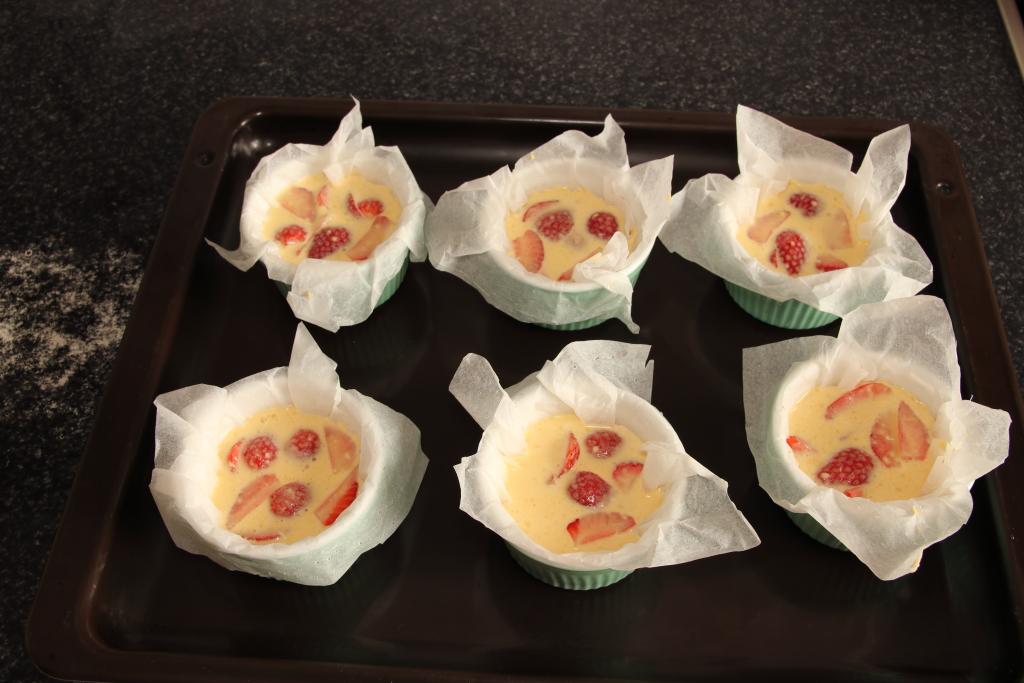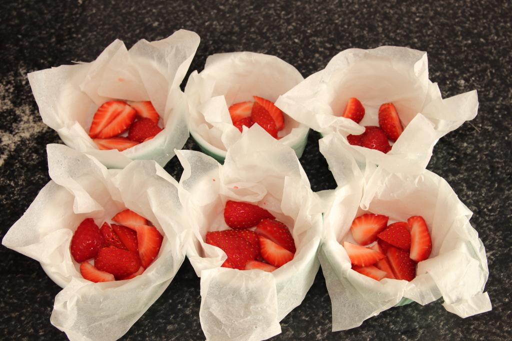 Lavamos las fresas (dejamos alguna para decorar), retiramos el pedúnculo verde y las cortamos en cuartos, reservamos.Cubrimos los moldes con papel de hornear humedecido, los colocamos en la bandeja de horno y colocamos 2 fresas (8 mitades) en cada uno. Reservamos.