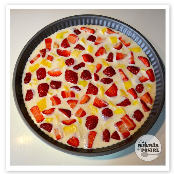 10. Vierte la masa en el molde que vayas a utilizar. Engrásalo con mantequilla para que luego te resulte más fácil desmoldarlo. Trocea las fresas y el mango y repártelos por toda la superficie del clafoutis.