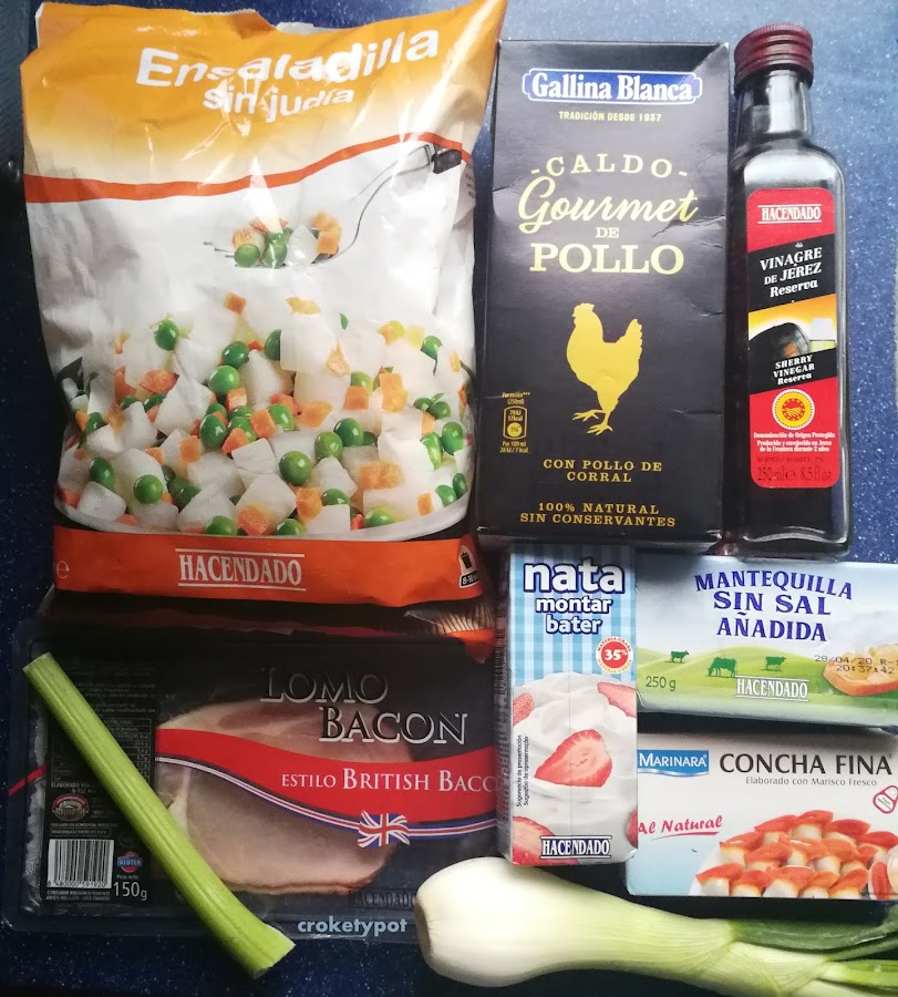 INGREDIENTES: (Para 2) Una lata de almejas o berberechos, hoy he puesto concha fina; ensaladilla congelada o bien patata y zanahoria, caldo de pollo, 2 lonchas de beicon, cebolla picada, un tallo de apio, nata (crema de leche), mantequilla , sal, pimienta y un chorreón de vinagre de jerez.