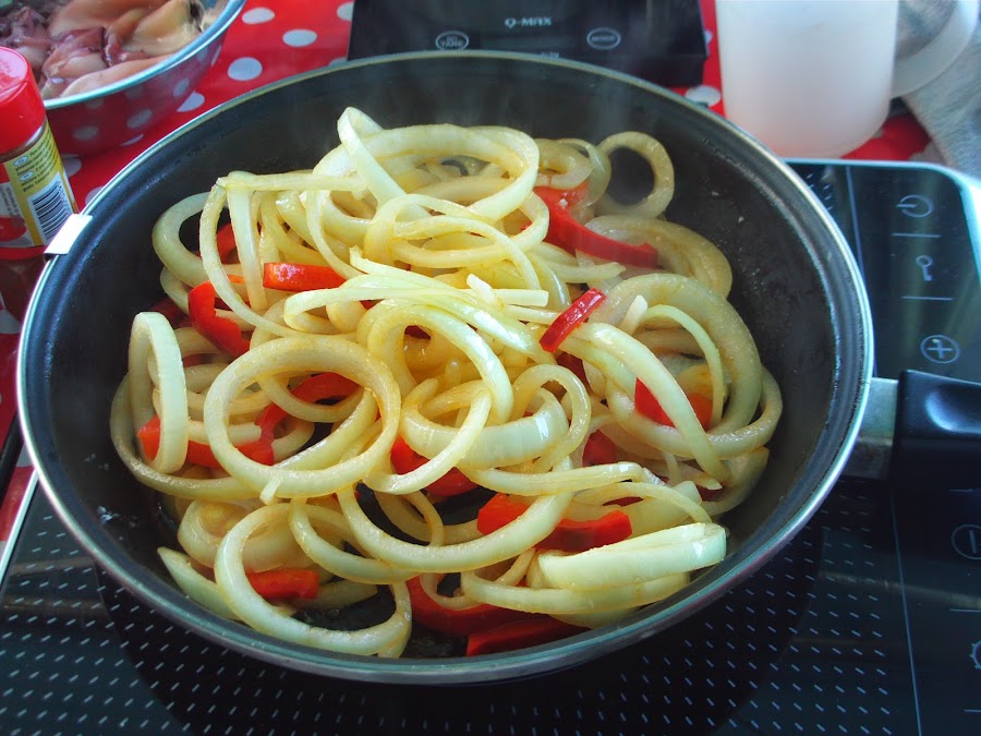 2- Cortamos las cebollas y los pimientos en juliana