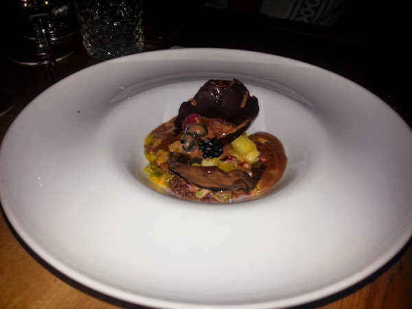 Como antes ya indique, de la cena lo que mas me gusto fueron los postres, los cuales eran Lingote de chocolate, tierra de cacao con pimienta rosa, gelee de fruta de la pasión y helado de café, que estaba muy rico y con mucho sabor a chocolate, Kinder sorpresa, como un huevo kinder de chocolate al cual le echaron chocolate caliente para que se abriera y dentro tenia frutas y peta-zetas que al meter a la boca el chocolate con lo de dentro tenias una explosión de sabor distinto, me gusto mucho, ya para acabar tartaleta de cítricos, crema de mantequilla de limón, espuma de mandarina, helado de yuzu y tuis de pomelo este postre fue el que menos me gusto aunque también estaba bueno lo que pasa que el chocolate para mi es lo mejor.