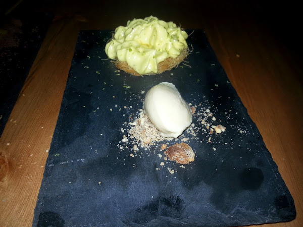 Después nos pusieron un pulpo a la parrilla, gofre de patata, mayonesa de kimchi y ajo fermentado, el pulpo estaba en su punto, con el gofre de patata y el toque de la mayonesa picante tenia un sabor distinto a como tenemos costumbre de comerlo. Como platos de pescado y carne nos dieron cabra en tempura, wok de verduras con leche de coco y gel de guindilla verde, nos pareció poco novedoso y nada elaborado mas bien un simple pescado rebozado con unas verduritas y algo de salsa y la carne era carrillera de ternera thay, souflé de arroz y verduritas, otro plato igual que el anterior que sin estar mal, para ser una comida de autor no tenían nada que nos sorprendiera.