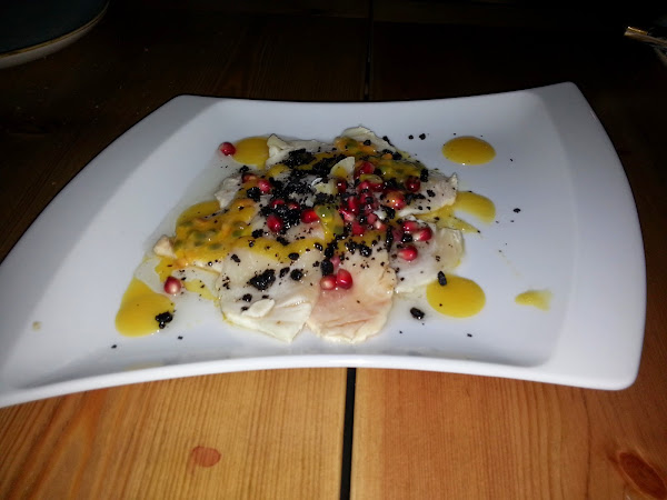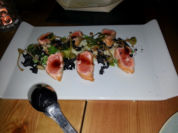 Para empezar nos trajeron un tar-tar de atún, guacamole, lima y yuzu que estaba muy rico y con algún sabor sorprendente como era el yuzu, continuamos con un tataki de salmón con alcaparras y aceituna deshidratada, nada especial para mi gusto y tiradito de pez mantequilla con aceite de café, granada y fruta de la pasión, este plato con los postres para mi pudo ser de lo mas distinto, un sabor con el aceite de café espectacular que a su vez en boca te daba otra sensación cuando lo juntabas con la granada.