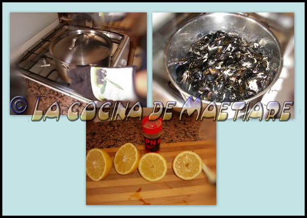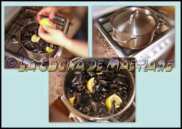 Sacudir la cacerola sujetando bien la tapa, eso ayudará a que las clochinas se mezclen bien y que puedan recibir por igual el calor. Iremos controlando que se vayan abriendo. Preparar los limones cortándolos por la mitad .