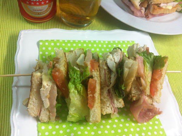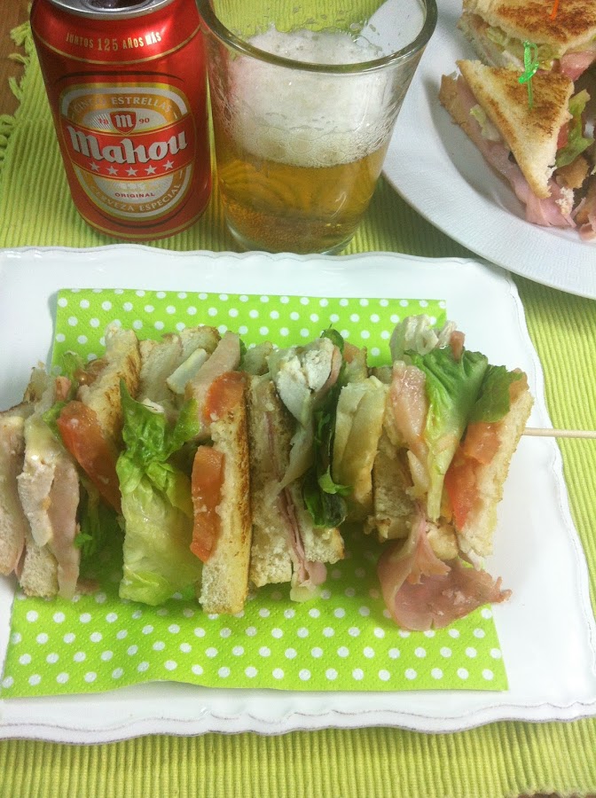 No hay manera de que no se desmorone, da igual usar los dedos o los cubiertos, a mi siempre se me "descuajeringa". Es fundamental cortar el sandwich en diagonal, en cuatro trozos. Os he mostrado las dos versiones de presentación, en brocheta alargada o en cuartos triangulares. Lo hice para la cena y me sirvió para hacer un tributo al VIPS CLUB.