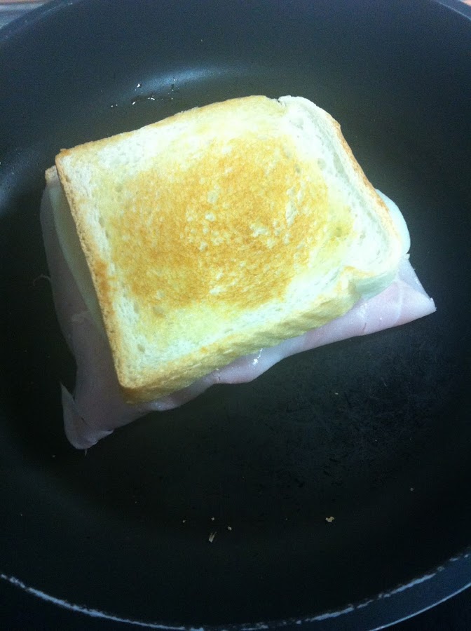 Se preparan dos sandwiches de jamón y queso y se untan las rebanadas con mantequilla. (Yo también prefiero poner aceite de oliva virgen, pero es que tengo ciertos problemas de exceso de colesterol y apenas tomo mantequilla).Se hacen a la plancha y se reservan.