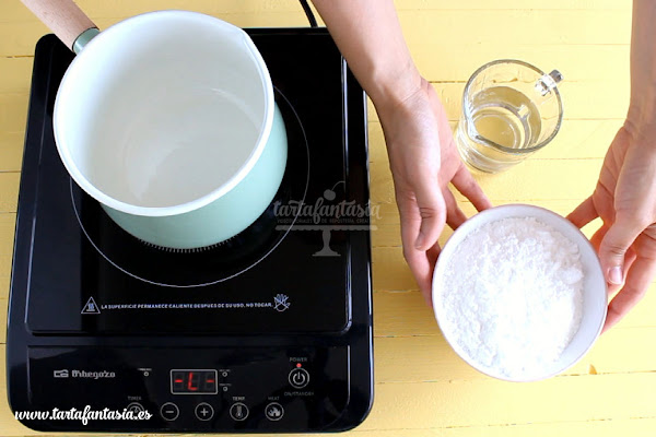 En un olla añadiremos el azúcar y los 125 ml de agua, lo llevaremos al fuego hasta que hierva.