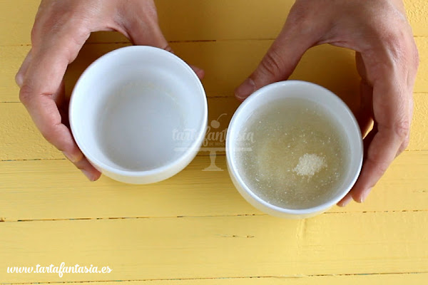 Después hidrataremos la gelatina con los 60 ml de agua y reservaremos, continuaremos con el resto de la receta.