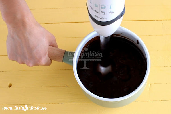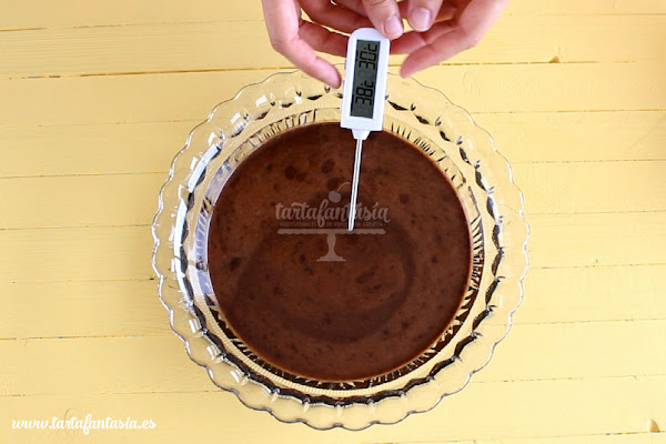 Necesitaremos un termómetro de cocina, es muy importante, nos indicará la temperatura exacta a la que tenemos que verter la cobertura sobre la tarta, 30ºC, una batidora de mano, y un colador para colar la cobertura por si ha quedada algún trocito de chocolate.