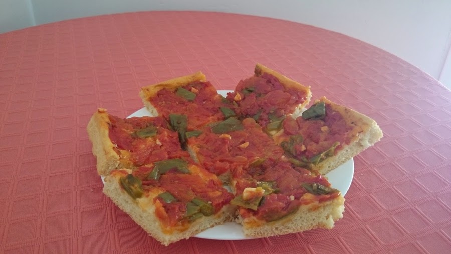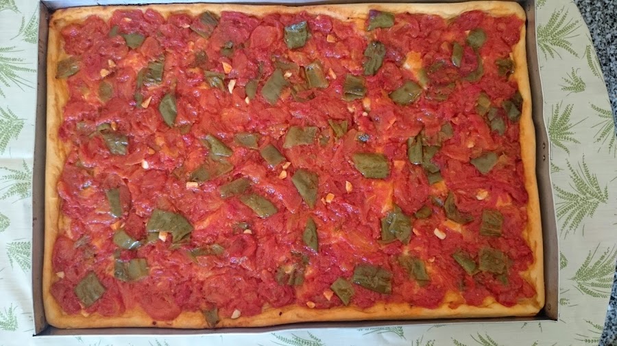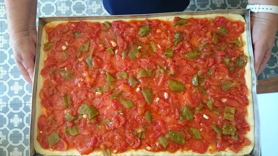 Ahora cogeremos una bandeja de horno (aquí en zona de valencia se le llama llanda), la untaremos con aceite y cogeremos la masa y la amasaremos sobre la bandeja extendiéndola por toda la bandeja haciéndole en todos los laterales unos rebordes para que cuando echemos el sofrito no se salga, cuando la tengamos extendida la masa la dejamos durante 10 min. para que termine de hacerse buena, y entonces cogemos el sofrito y lo echamos por encima de la masa extenciéndola equitativamente para que quede bien repartida, cogemos el puñadito de piñones y los repartimos por toda la coca y pasamos a proceder a la cocción en el horno que previamente habremos precalentado a 180º durante 50-60 min. iremos viéndola cuando se aproxime el tiempo final de cocción para que no se nos queme y apagamos el horno, dejamos enfriar y cortamos en trozos para servir, espero que les guste.