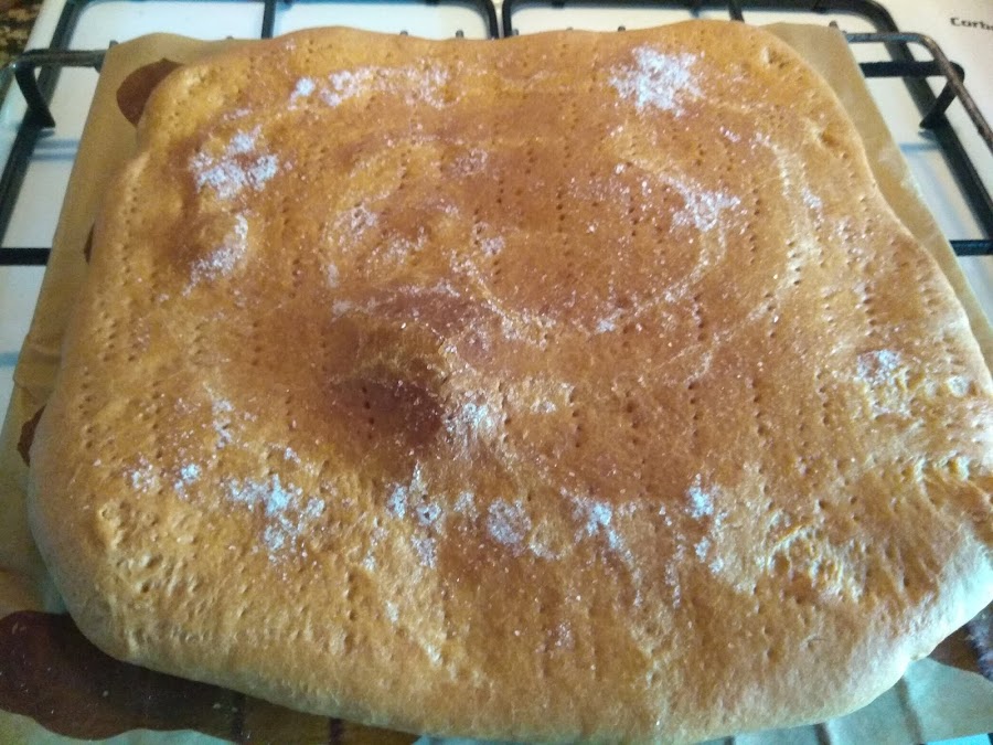 Estiramos la masa con un rodillo dándole la forma deseada,pinchamos con un tenedor por toda la masa y le echamos por encima un chorrón de aceite sal bien repartido por todo.