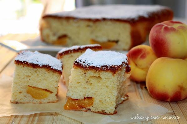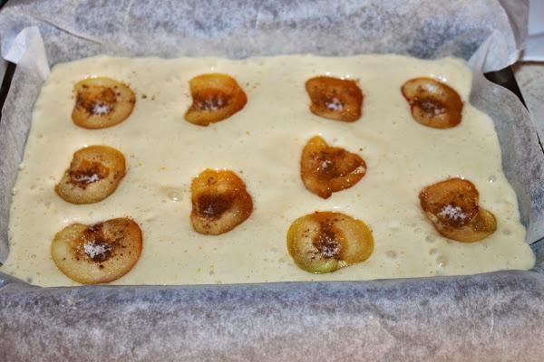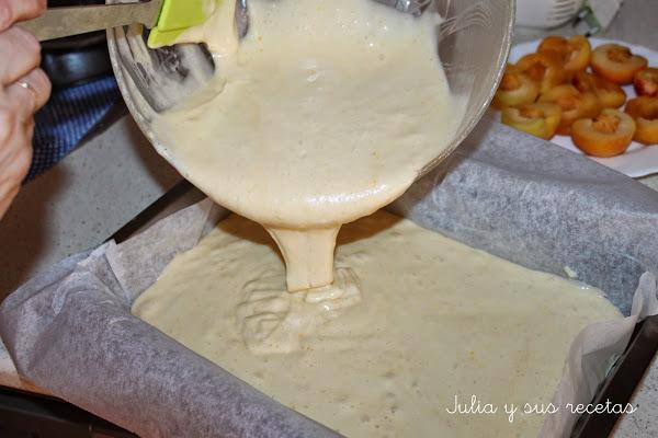 Le ponemos los albaricoques encima, los espolvoreamos con azúcar y canela. Para que no se undan hasta el fondo mejor los pasáis por la parte de abajo por harina, yo no lo hice, se me olvidó, y se me fueron al fondo.