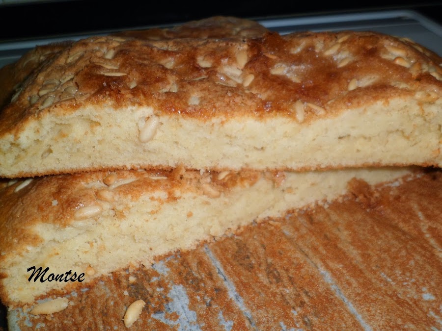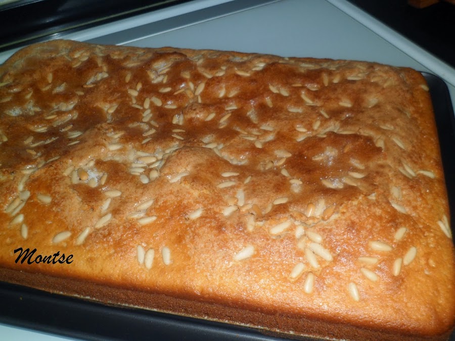 Aquí os dejo esta rica coca, que en sí es un bizcocho que hago en casa y que tengo en el blog, como el bizcocho de las monjitas,solo le añado el anís y los piñones y como veréis le pongo unos sobres de gaseosas que hace que quede muy esponjoso y rico.