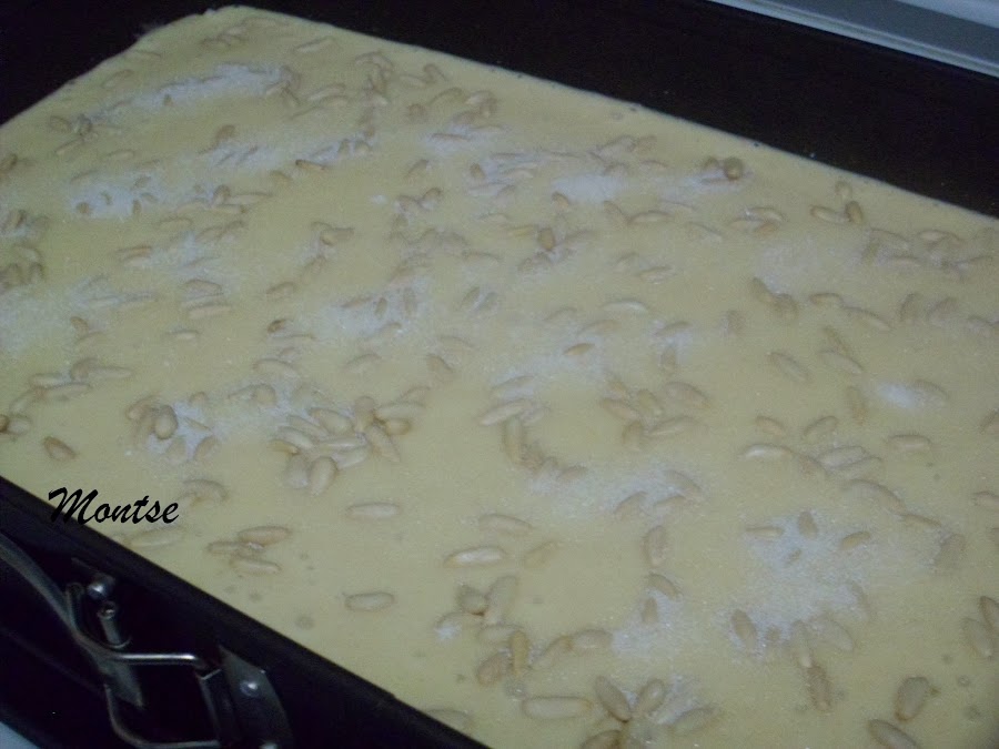 Echaremos la masa que tenemos preparada, cubriremos con los piñones y espolvorearemos azúcar, lo meteremos al horno, yo lo bajé a 150º.