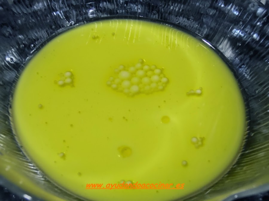 Poner en un recipiente, la leche, el agua, el aceite de oliva y templar, bien en el microondas o poniendo un cazo a calentar. (en ambos casos hasta que la mezcla este templada).