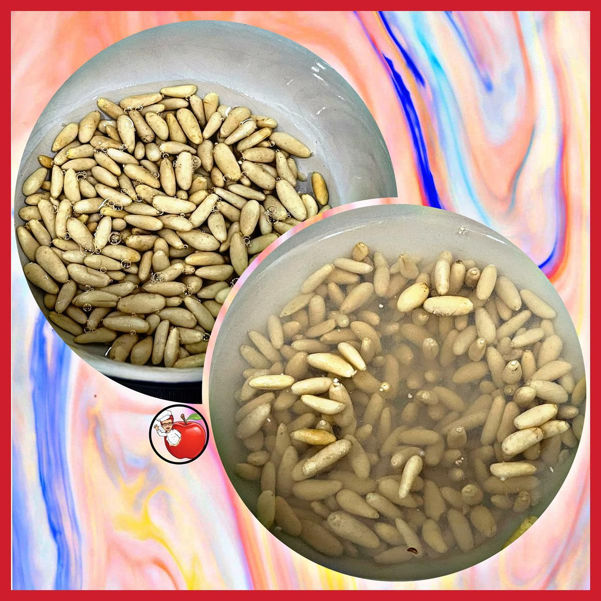 Ponemos 50 gramos de piñones en un bol con un chorrito de anís dulce y lo cubrimos con agua (esto será para hidratar los piñones y a la hora de ponerlos en el horno no se nos quemen) y reservamos.