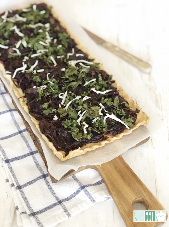 Precalentar el horno a 180º, en una bandeja de horno rectangular alargada, cubrirla con papel de horno, extender la masa, pincharla con un tenedor. Espolvorear con un poco de harina y dejarla unos minutos en la nevera. Cuando estén las cebollas listas, colocarlas encima de la masa, sazonar al gusto, añadir por encima el perejil y hornear 40 min.