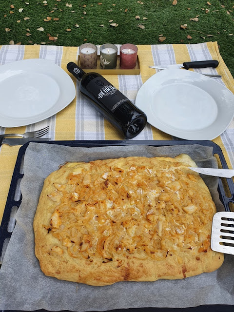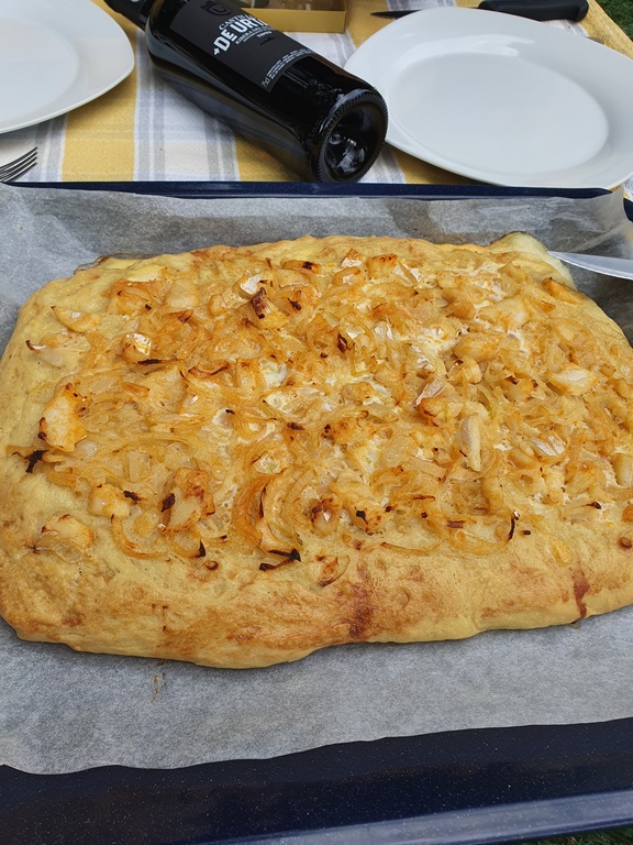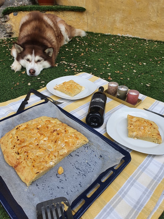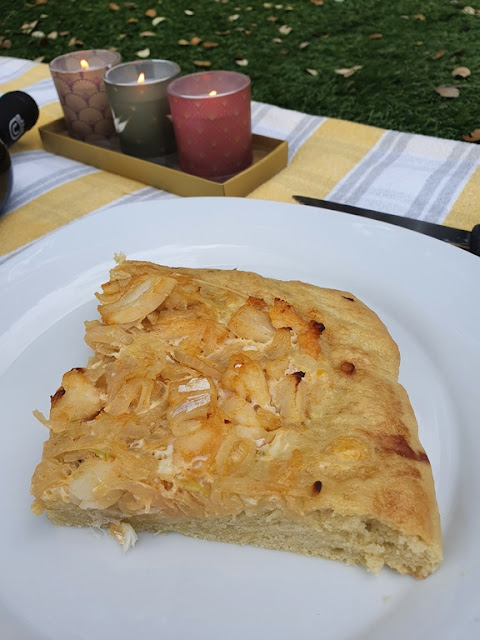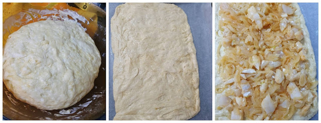Esta es mi aportación para este mes en el Desafío en la Cocina una coca abierta de cebolla y bacalao