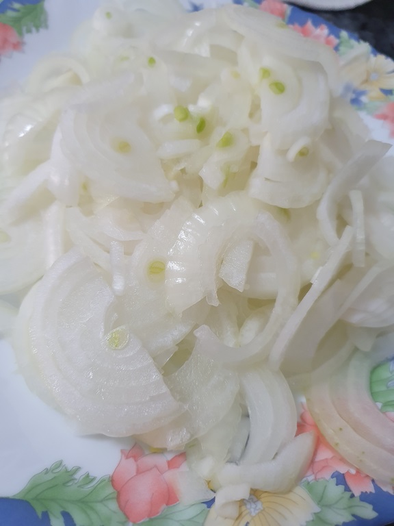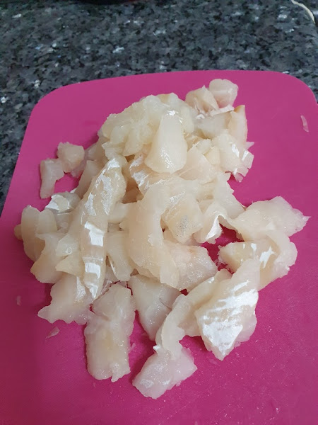 Troceamos las cebollas y cortamos en trozos más pequeños el bacalao.