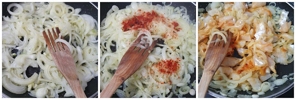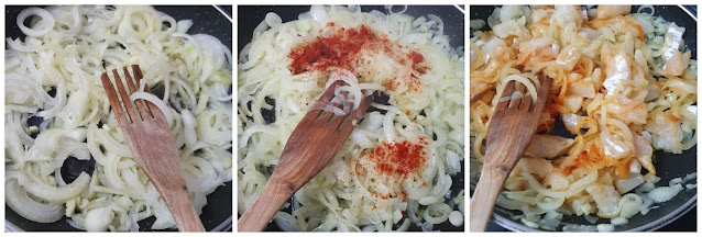 En una sartén con un poco de aceite de oliva virgen pochamos la cebolla durante 5 minutos a continuación añadimos un poco de pimentón dulce, el bacalao desmigado removemos y retiramos del fuego.