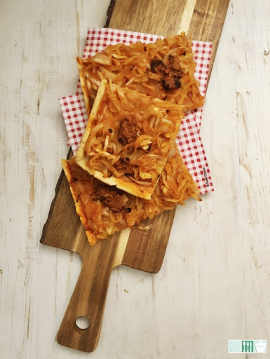 Después de hacer los cocarrois en el directo de @Creativisim, podéis ver el tutorial en este enlace me sobró cebolla aliñada y los cocarrois se fueron al congelador, preparé un poco mas de masa y en un plis tenía esta coca de cebolla con sobrasada. Que no os de pereza, en nada esta hecha.