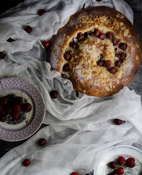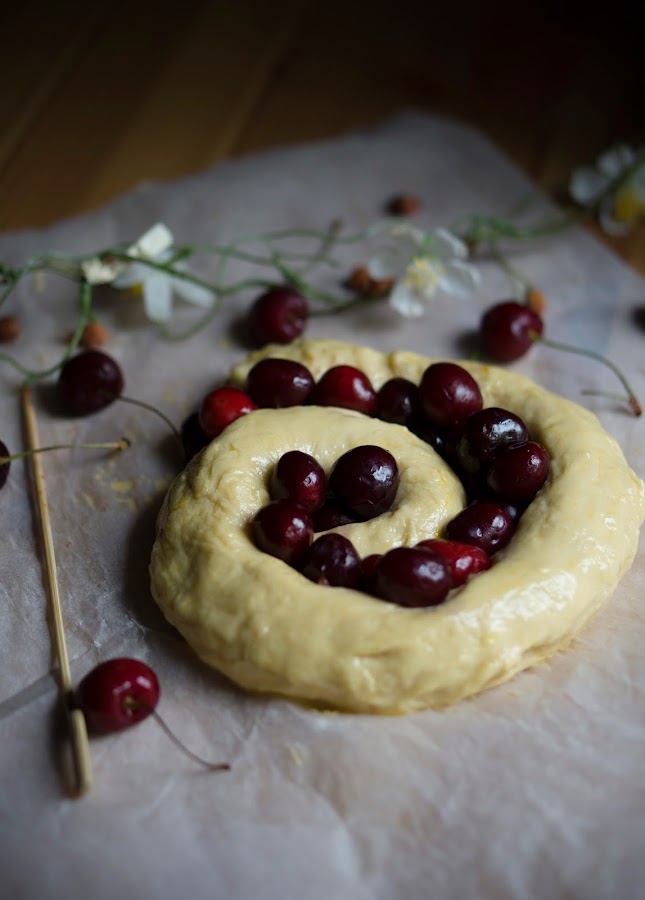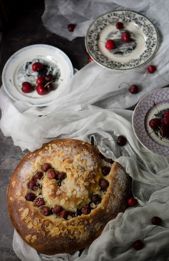 3. Transcurrido el tiempo dividir la masa en dos porciones iguales. Con una he hecho un cordón largo y le he dado forma de espiral. Pintar con huevo batido mezclado con una cucharada de leche y acomodar las cerezas limpias sin hueso en los huecos que han quedado en la espiral. Esparcir las almendras fileteadas y azúcar blanquilla por encima. Dejar levar hasta que doble su volumen.