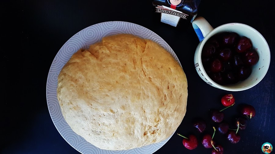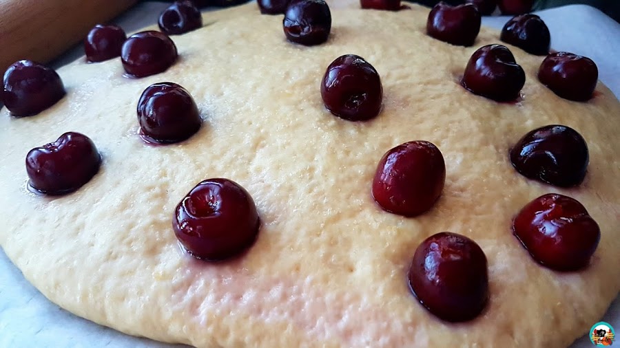 Extendemos la masa con la ayuda de un rodillo. Disponemos las cerezas maceradas en licor sobre la masa. Dejamos que la masa repose 30 minutos más. Pincelamos la coca con un huevo batido.