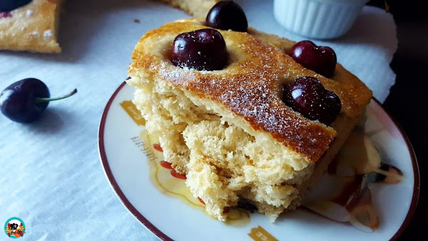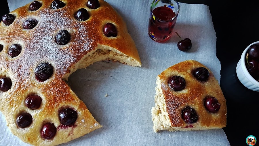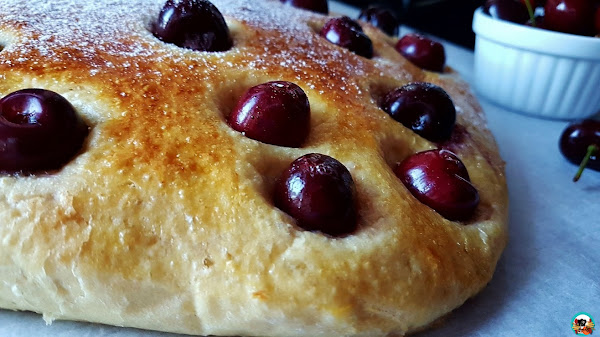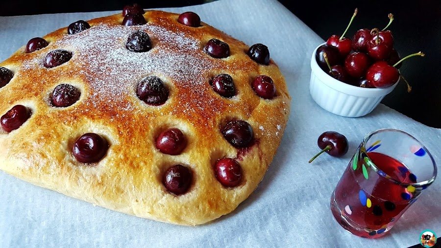 Después de algunas semanas sin escribir hoy os traigo una coca de cerezas maceradas en licor.