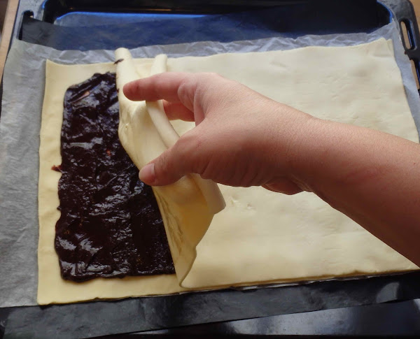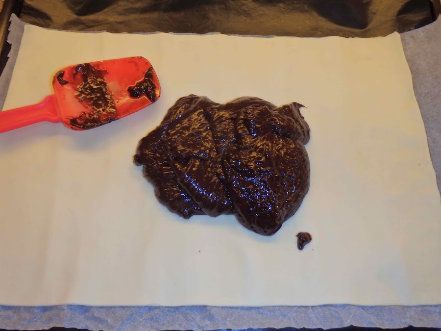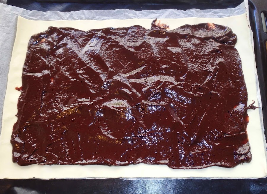 Una vez el chocolate fundido extendemos una plancha de hojaldre en una bandeja de horno sobre el mismo papel que viene en le paquete y por encima repartimos el chocolate fundido.