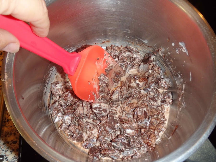 Ponemos a fundir el chocolate picado con la nata (crema de leche) a fuego muy bajo y sin parar de remover para que no se nos pegue.