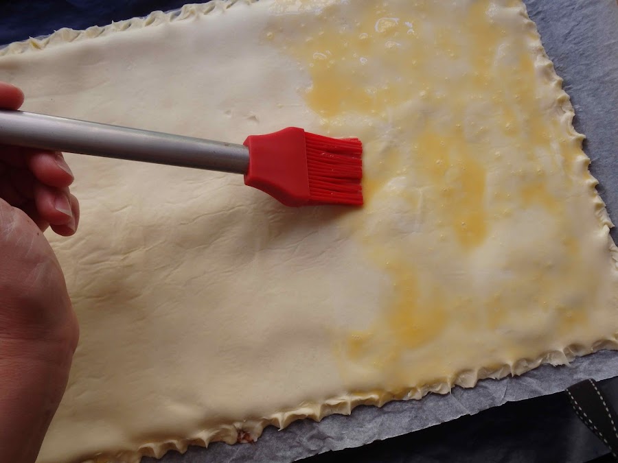 Con el huevo batido pintamos toda la superficie de la coca y la pinchamos con un tenedor por toda la parte superior, es muy importante ya que si no se hincharía por el vapor que queda encerrado y no quedaría bien.