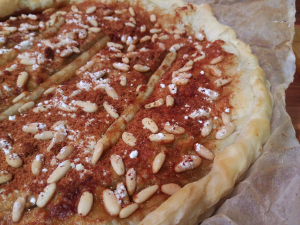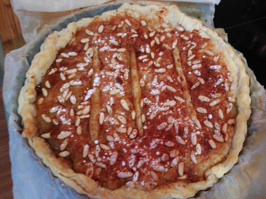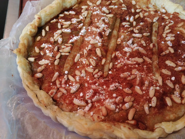 - Pincelamos con huevo batido toda la superficie, espolvoreamos los piñones, el azúcar glass y el azúcar de coco.